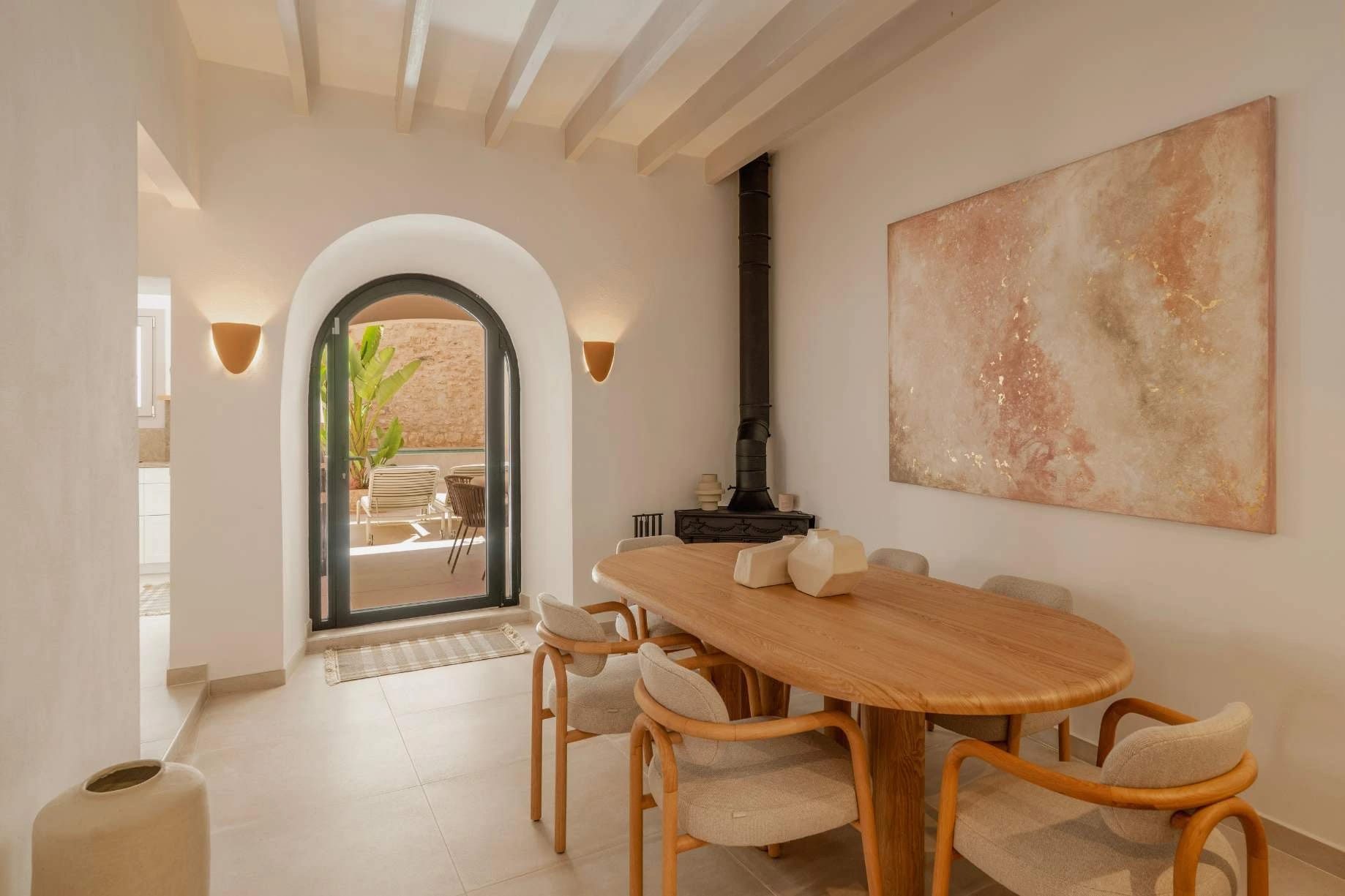 This Mediterranean townhouse combines the best of both worlds: Nestled in the popular village of Santanyi with its golden sandstone buildings and a variety of charming restaurants and cafés right on the doorstep, you will experience a central urban location and an oasis of peace at the same time. On the ground floor, you will find a cosy inner courtyard with a sunny terrace and a small pool, which is perfect for a refreshing dip on warm days. There is another south-facing terrace on the upper floor, which is directly accessible from the master bedroom - perfect for sunbathing and relaxing under the stars on warm evenings or for soothing hours in the outdoor sauna. In addition, a fireplace in the living area ensures a cosy atmosphere and invites you to enjoy evenings together. The beautiful bay of Cala Santanyi is just 10 minutes away, where you can enjoy turquoise waters and a fine sandy beach. In addition, the second largest natural park in the Balearic Islands, Mondragó, is just 15 minutes away and offers numerous hiking and cycling trails.