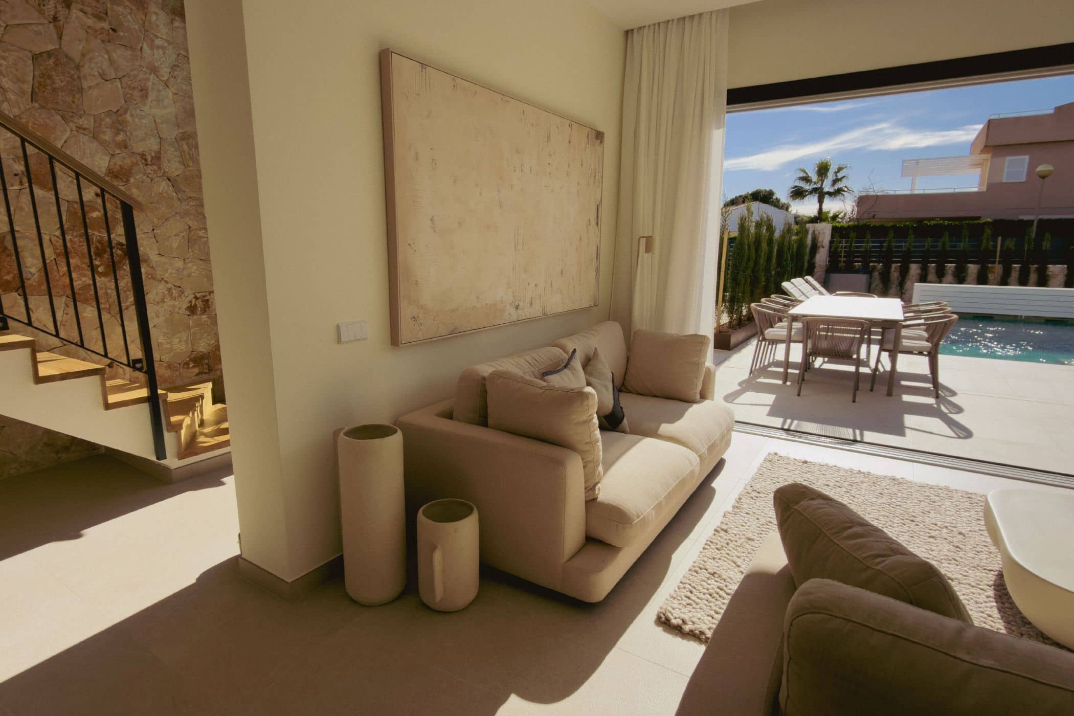 Just a few steps from the turquoise waters of Playa Sa Ràpita, this modern new-build villa is situated in a peaceful coastal location with magnificent panoramic views of the wide sea. On your sunny south-west-facing terrace with pool, you can experience the Mediterranean lifestyle in its most beautiful form: relaxing in the sun, taking a dip in the cool water or al fresco dining. Another highlight is the roof terrace with outdoor kitchen - where the beautiful landscape and enjoyment blend together: relaxed evenings, dreamlike sunsets and the view over the sea create unforgettable moments. The supermarket and restaurants are within walking distance and the surrounding area has fantastic beaches within walking distance as well as various activities for young and old. The nearby marina also has access to a wide range of water sports.