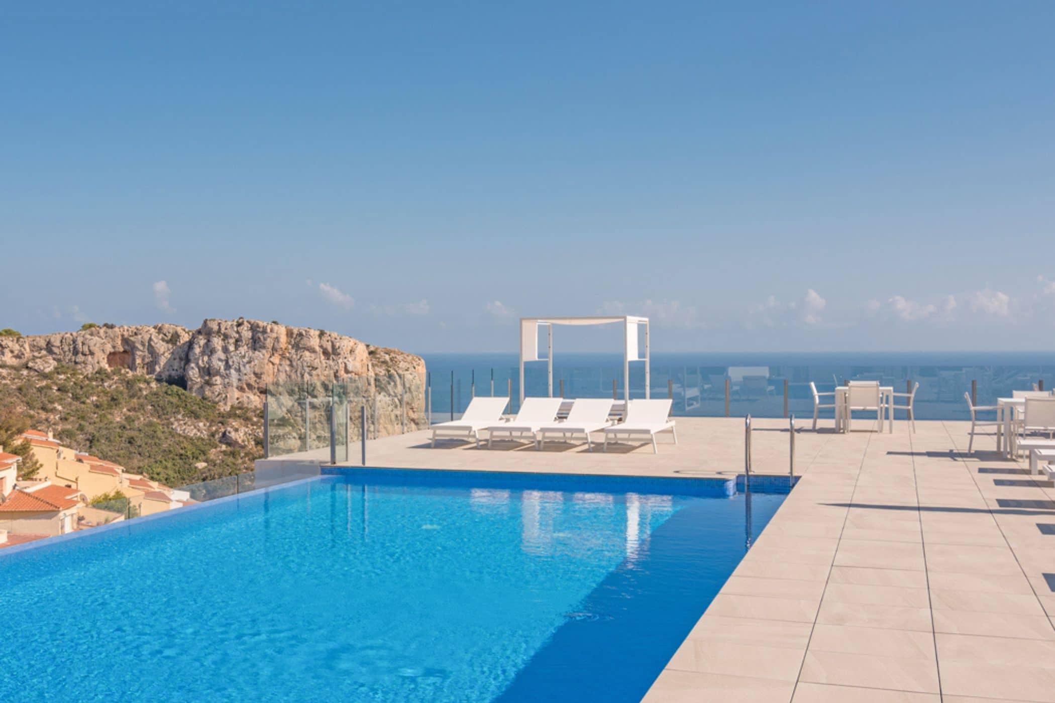 In an elevated cliff position on the Costa Blanca, this modern apartment delights with an impressive panoramic sea view and an extraordinary holiday feeling between sky and sea. The sunny south-west terrace becomes the center of life: sunbathing, relaxed lounging, or shared meals under the open sky – always accompanied by an impressive view of the sea and the cliffs. Large window fronts allow this backdrop to be present indoors as well, creating a bright, open sense of space. A shared pool (infinity pool) with a sea view, a heated indoor pool, and a fitness and wellness area with a sauna offer relaxation at the highest level. The Cala del Moraig pebble beach is reachable in a few minutes by car and delights with crystal-clear water and the famous Cova dels Arcs cave – a true paradise for snorkelers. Restaurants & shops nearby for daily needs are easily accessible within walking distance within the 'Cumbre del Sol' urbanization. Tennis and padel courts are also available nearby, and the Xàbia Golf Club is only about 10 minutes away by car. Charming Moraira, with its marina, excellent gastronomy, and diverse shopping opportunities, is just around 15 minutes away.
